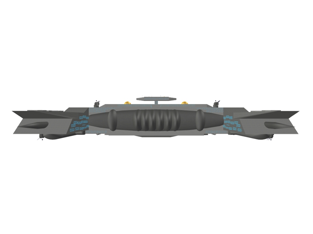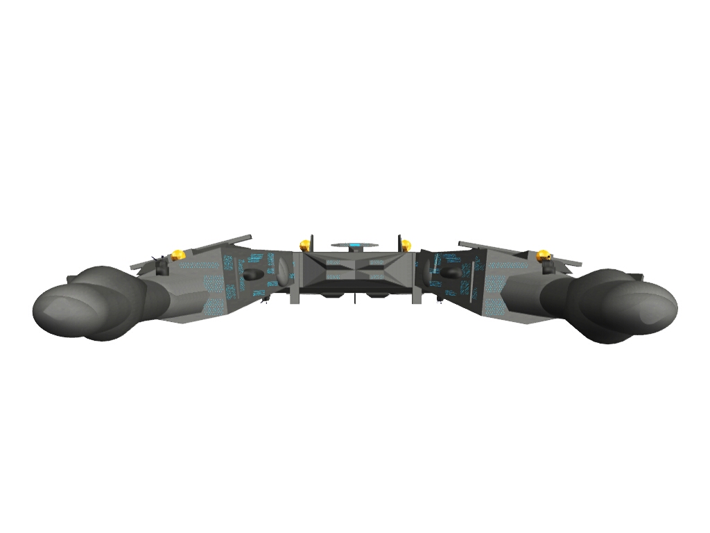 Gros plan sur les réacteurs et la soute. Notez la présence du berceau de l'USS Chouchou |